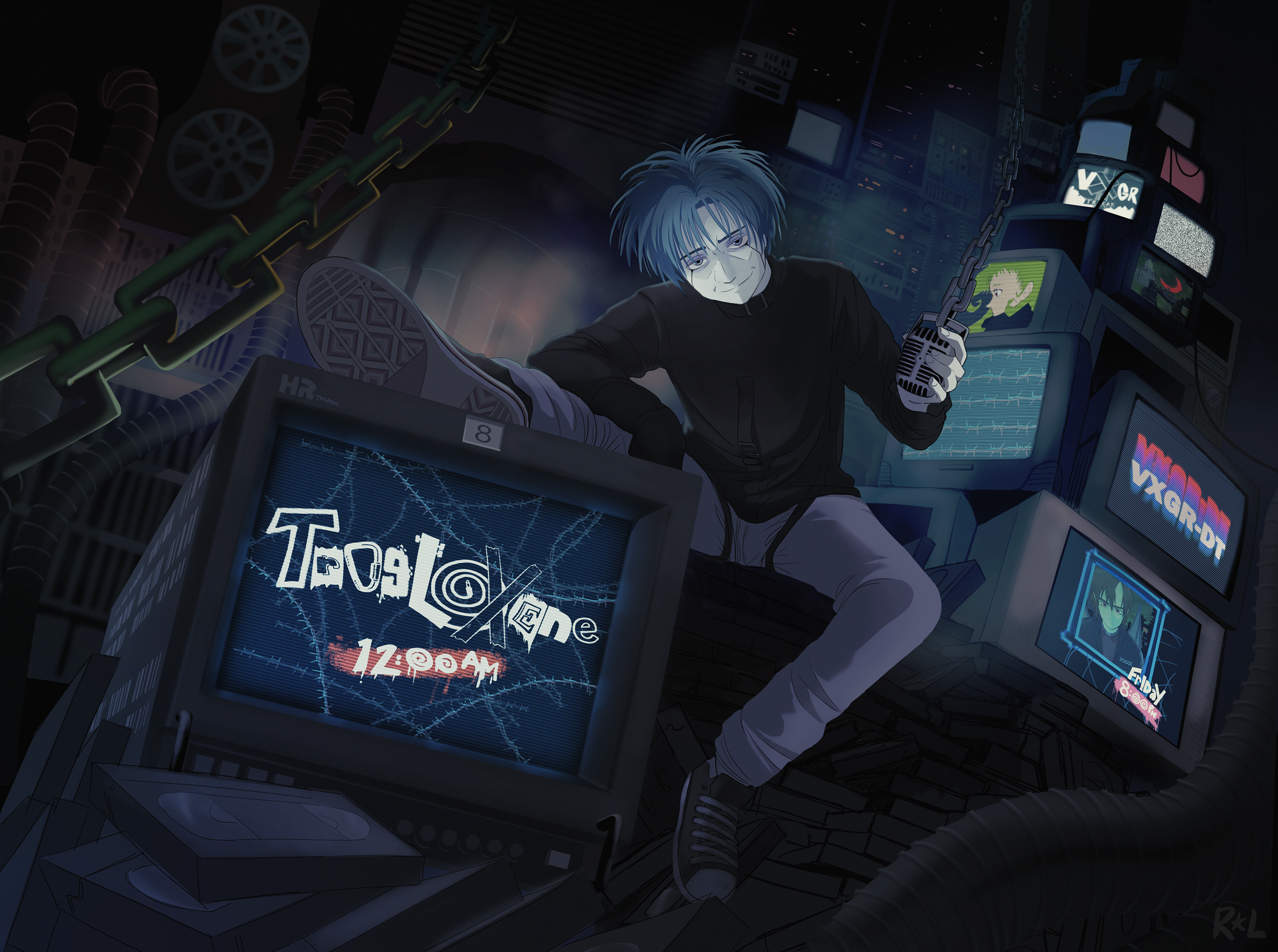 An illustration of my character Mog, a variety show host, in their studio room, with “Trogloxene” being the name of their show. My overall aesthetic for this project is old grungy tapes and video tech, and I wanted the set to center around that theme, and have the screens show my other characters involved.