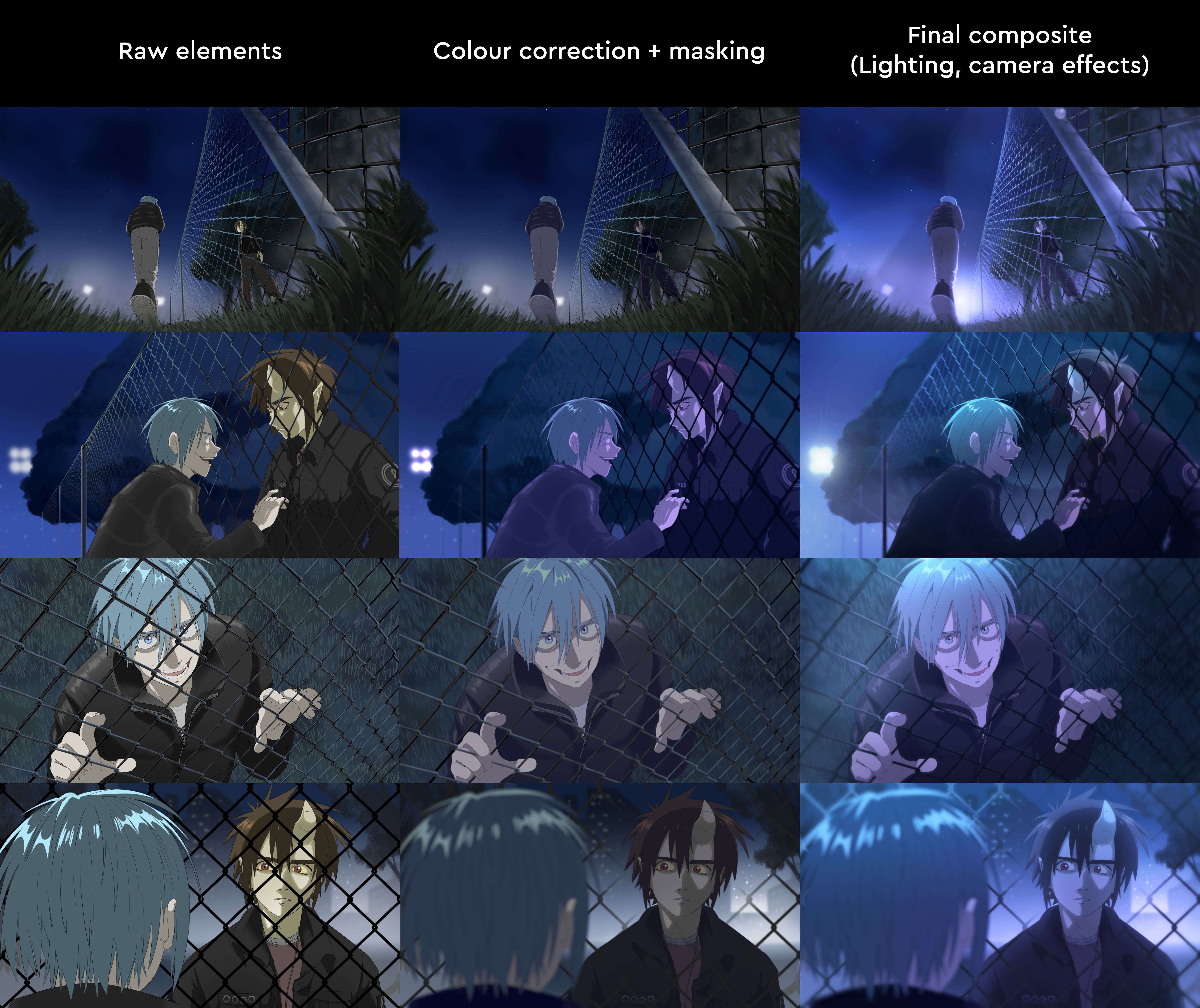 A compositing exercise I did with the goal of looking like anime screenshots. Drawn in Photoshop, composited in After Effects.
